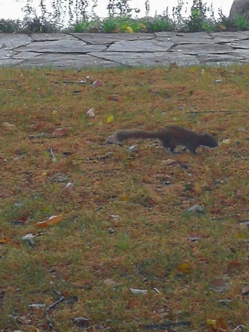 走进了苏堤,遍地是林荫。天空已经乌云密布,下起了小雨,山间是朦胧的;而另一边,阳光依旧洒在湖面上。总之,就是“水光潋滟晴方好,山色空蒙雨亦奇"。美丽的苏堤上自有美丽的环境,而这美丽的环境居然能招来可爱的小松鼠,多么美好!