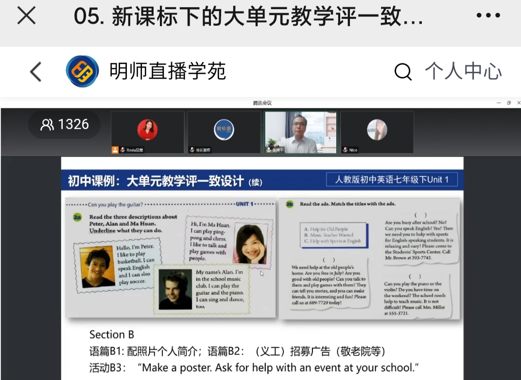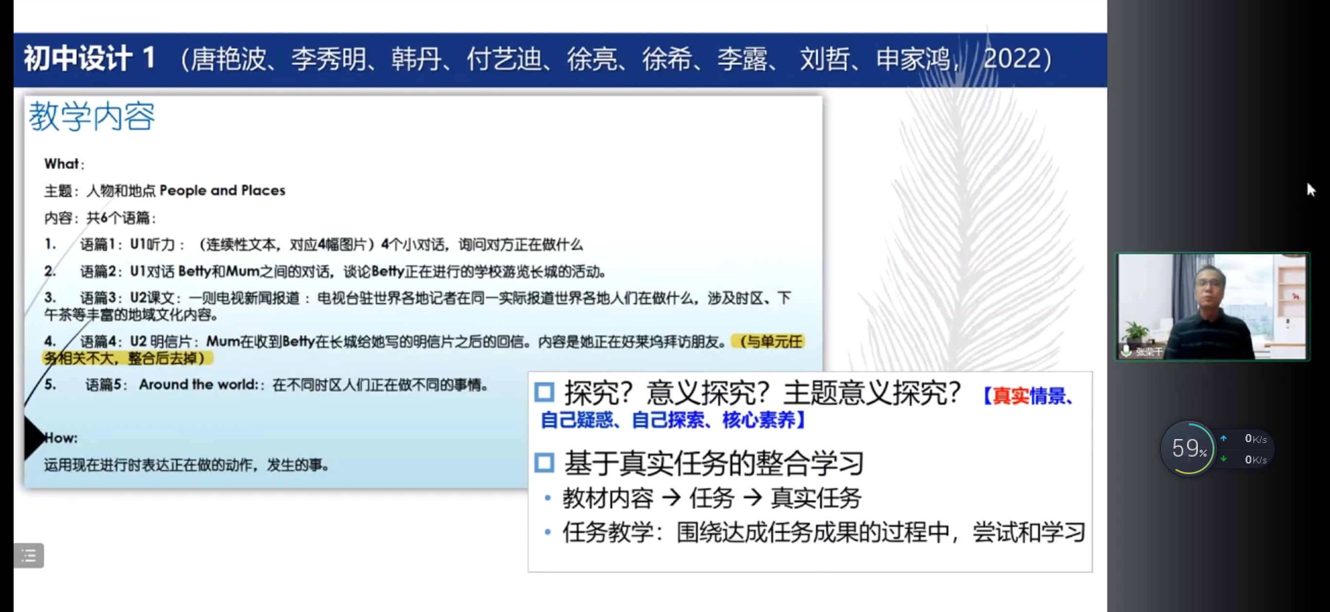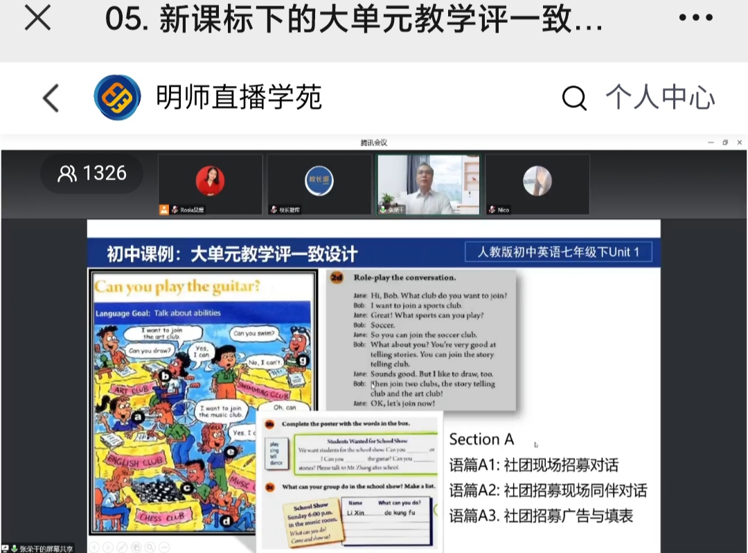 在讲座开始,张教授以总览的形式让我们对讲座主线一目了然,张教授的讲座共分为四大版块:1. 大单元教学设计:为什么?2. 教学评一致:为什么?3. 大单元教学评一致设计。4. 进一步思考与尝试设计。由此可见,每个版块之间逻辑紧密,紧紧围绕本次讲座的主题一一展开论述,而每个版块内部的分点讲述也是层层推进,既有理论引领,又有实施路径建议,同时,整个讲座将2022版义务教育课程标准里与本次讲座主题相关的内容多处多点节选,并引用国内外文献,对理论术语详细阐释,如:单元,核心素养发展观,教学评价。有了前三块详实的理论支架,张教授随后分别精选了小学外研版教材四年级上册Module1的课例和初中人教版教材七年级下册的Unit 1 Can you play the guitar?的课例,小学课例分单元Unit1 Go straight on.和Unit 2 It’s at the station.,初中课例分Section A Section B,从真实语言运用视角和素养目标发展视角,讲解如何去做大单元教学评一致设计,可见,本次讲座是切实做到了将理论和实践相结合,其中,张教授谈到自己做的任务教学过程研究:即话题引入-任务呈现-任务尝试(1,2……)-成果展评-任务反审,这种教学评一致的课堂模式归纳,对我们一线教师非常受用。最后,张教授抛出一个问题:在基于真实任务的整合学习大单元设计中,如何实施以促进发展为目的的教学评价?教授以问题来启发我们对本次讲座的深度思考,以问题来鞭策我们对教学评价如何促进学生学习和发展进行持续学习和研究,实有余音绕梁之感。