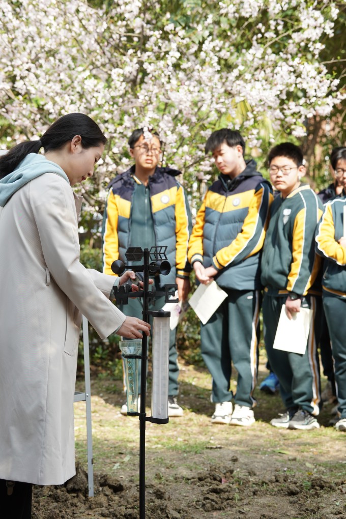 仪式第二项流程是梁昌波和潘国强为气象台培土奠基,并为百叶箱揭幕。参加仪式的领导、老师、同学们合影留念后,学校的地理教研组长苏静老师为同学们介绍百叶箱、三合一雨量计、三合一风速仪等测量工具的使用方法。