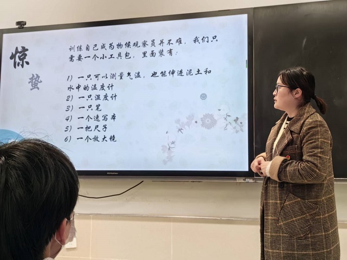 为了更好地探索昆虫的奥秘,2023年3月20日,合肥一六八陶冲湖中学生物李琳老师为校园气象站的同学们上了一场生动有趣的物候日志课。