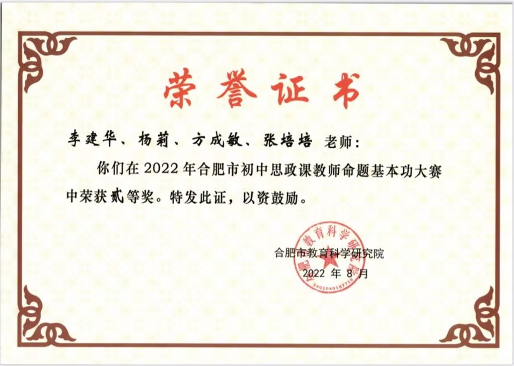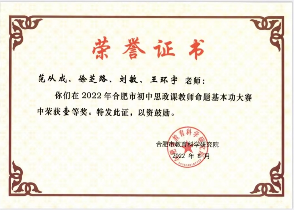 命题能力是教师必备的一项基本技能,也是学科专业水平的重要体现。近日,合肥市教育科学研究院公布了合肥市初中思政课教师命题基本功大赛评选结果,合肥一六八陶冲湖中学教师徐芝路、刘敏、杨莉老师获得一等奖。
