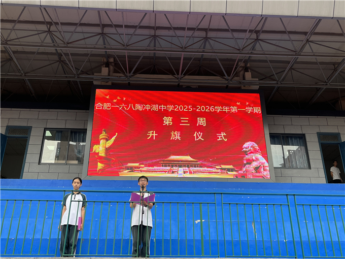 2025年9月15日,合肥一六八陶冲湖中学举行了本学期第3周升旗仪式,全体师生列队参加。担任本次升旗仪式的班级是八(2)班,班主任程斌老师,主持人是来自八(2)班的郑迦恩同学。