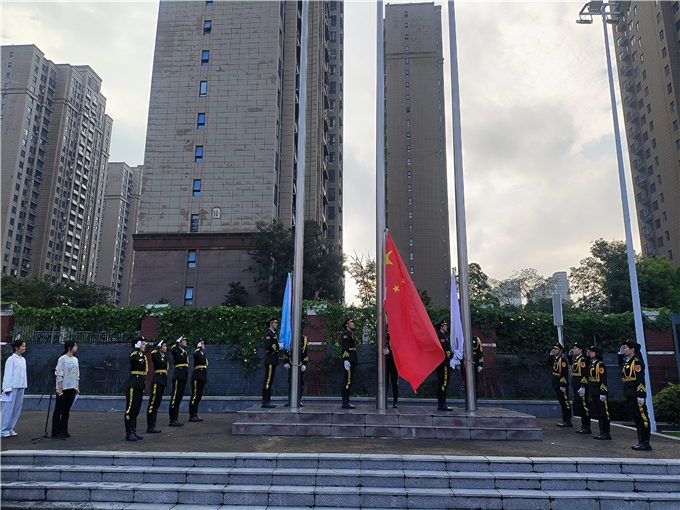 沐浴着清晨的阳光,国旗护卫队迈着铿锵有力的步伐,庄严护送国旗入场。激昂的国歌响彻天空,五星红旗冉冉升起。全体师生肃然而立,注视那一片鲜红,心中涌动着对祖国无比的自豪与敬意。