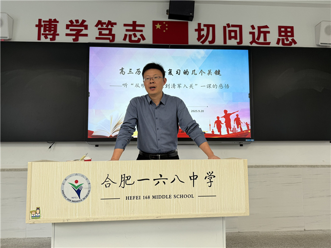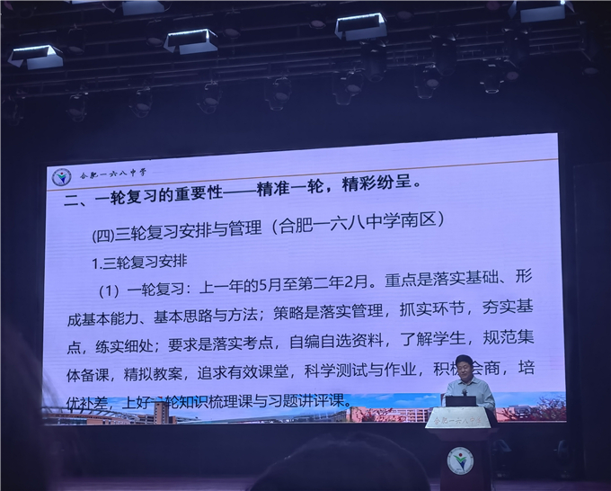 研讨会伊始,合肥一六八中学副校长苏键作了题为《科学备考,精准施策》的专题报告。报告从教育集团层面系统介绍了高考一轮复习的整体规划与创新举措,详细阐释了“数据驱动的学情诊断体系”建设方案,分享了跨校优质教学资源整合的有效路径,重点解读了“基础夯实—题型突破—模拟提升”三阶段复习模式的具体实施策略。报告内容系统全面,既有理论高度,又具实践指导意义,为高复年级一轮复习工作提供了清晰的实施路径和方法指引。、