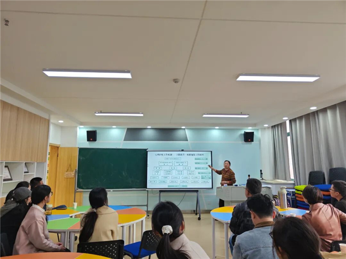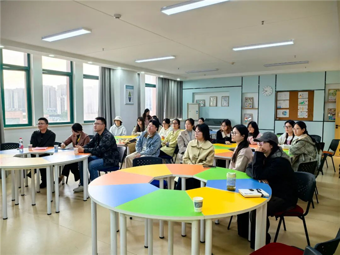 在团体活动教室,合肥一六八陶冲湖中学副校长赵锋林系统介绍了学校心理健康教育的整体架构与特色实践,包括课程体系建设、心理预警机制运作、品牌活动开展等内容,全面展示了学校在心理健康教育方面的扎实工作与创新探索。