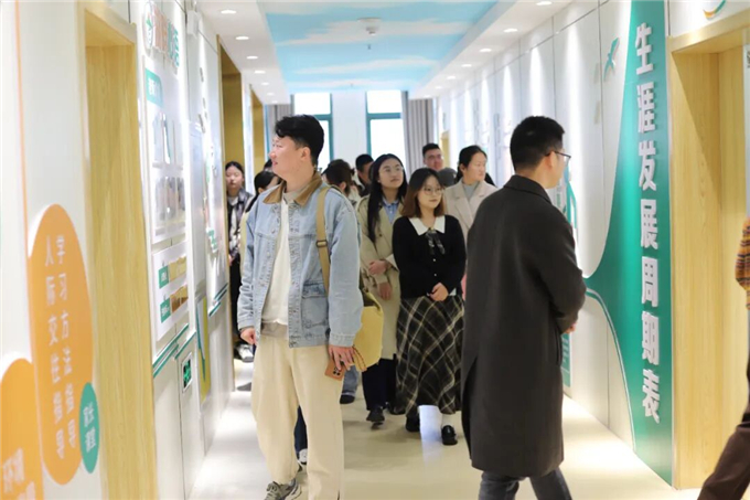 随后,全体人员在引导下参观了设施齐全的学生发展指导中心,实地考察了个体辅导室、沙盘室、VR宣泄室等专业空间,并对各功能区的设计理念与实际应用进行了深入了解。