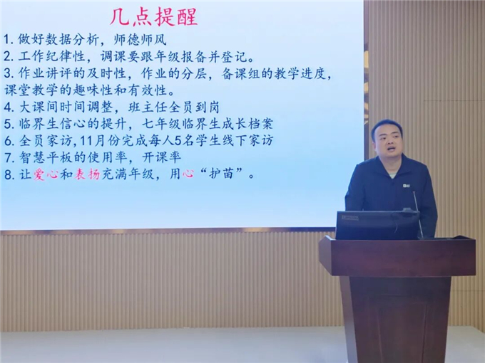 接着,陆民强主任进一步强调了师德师风建设的重要性,呼吁全体教师以高尚的品格感染学生,以专业的素养引导学生。在教学方面,他提出作业应科学分层,兼顾基础与拓展;课堂应增强趣味性,激发学生学习主动性。他特别指出,要用“爱心”和“表扬”营造温暖积极的年级氛围,让每一棵“幼苗”在关爱中茁壮成长。