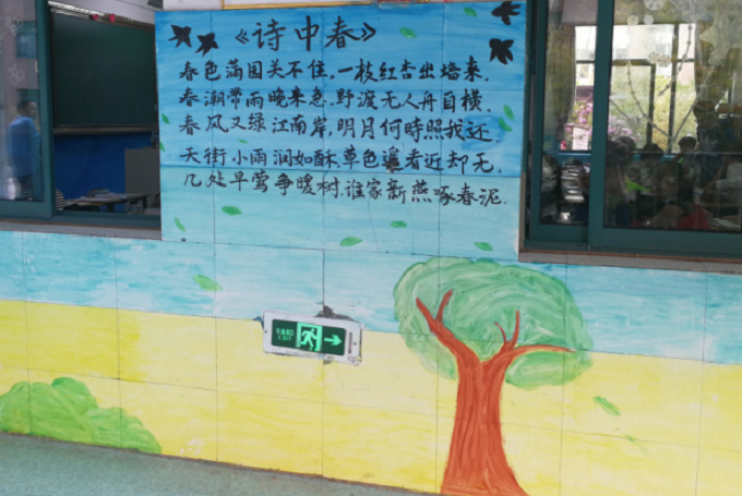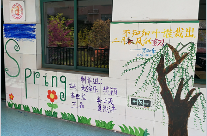 当缕缕春风透进了心窗,是如此的亲切。春意盎然,春已携着柔柔的雨润润而来到了8班的廊道。春天是一年中最美丽的季节,古往今来人们几乎用尽了所有美好的词语诗句来形容、赞美春天。春天,带给人生命力,带给人希望。8班使用了古诗词和绘画结合的方法,分别采用了《咏柳》和《游园不值》两首诗中的“不知细叶谁裁出,二月春风似剪刀”“应怜屐齿印苍苔,小扣柴扉久不开。春色满园关不住,一枝红杏出墙来”。