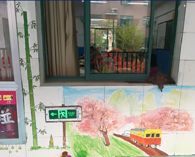 七班的廊道描述的正是我们陶冲湖的校园,左边小一点的墙上的那棵花树,可能已经有同学看出来了,正是C、D楼间小花园的那颗花树,虽然颜色有变,却一点不改它的神韵。右墙的那一派生机,正象征着我们,朝气蓬勃的青少年。