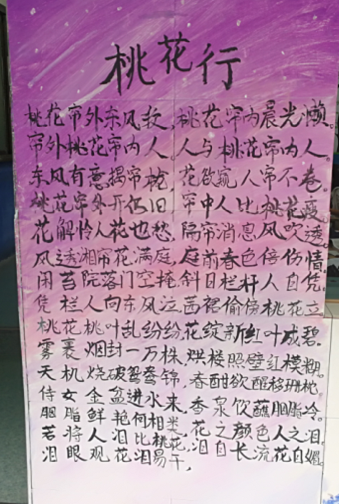在以粉为基调的浪漫星空中,九班宣传组的女生们用一首《桃花行》将人带到如诗如画的仙境中,引起人们的无限遐想。可能是因为时间原因吧,九班的廊报并没有制作完成,相信完工后的他们会更出彩。