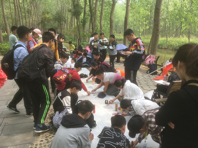 公园深处,有大片空地。老师铺开十米画卷,鼓励每位同学用画笔绘出梦的色彩。跃跃欲试的我们一直欢呼,伏在地上,用明亮的线条勾勒脑海中的天马行空,一笔一笔,绘出的是这个年纪的青涩、轻狂、天真、美好。画布上的每一幅图,合成一幅十米长卷。就像原本素不相识的五十三个来自各地的我们,因为缘分,成为一个班,成为了,一个集体。