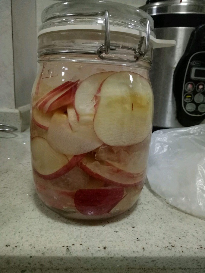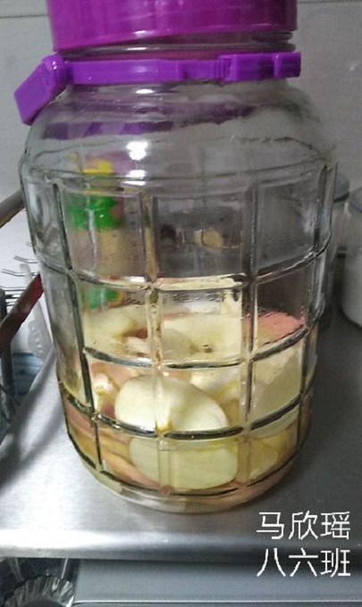 时间还可以让食物发酵,让简单的食材变成更令人惊叹的美味。比如葡萄酒,奶酪等等,当然还有家常的咸鸭蛋,乃至我们爱吃的泡菜。经过食材的搭配,时间的沉淀,一点点变成了经久不衰的美食。我今天做的苹果醋,也是这样需要时间改变的“佳酿”。自己做的苹果醋,可以感受到成功的喜悦,还能感受到有香甜的苹果味道,也许这就是劳动的喜悦吧!