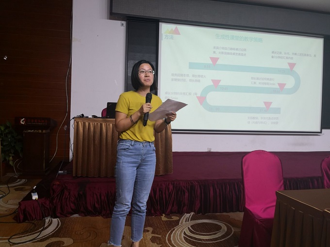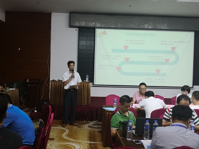 主持人首先提出本次交流的主题是“生成性课堂的教学策略"。接着我们分成八大组先小组内交流。每一个老师轮流发言,围绕主题结合自己的教学实践发表自己的看法。这个主题很接地气,老师们的讨论很投入很火热,最终形成本组的五个重要观点。然后,各个组员再带着本组的观点到其他组讨论交流。最后回到本组再将不同的观点进行交换、辨析和整合,并由组长代表大家上台交流。