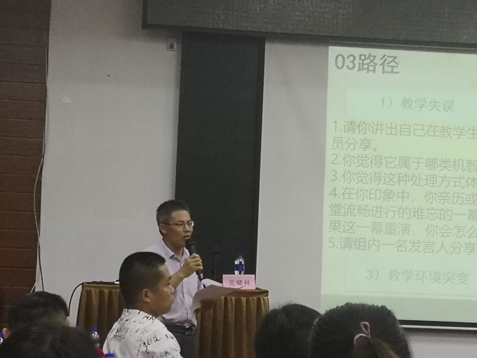 党老师年轻优雅,侃侃而谈。她用电影片段和自己的课堂经验让我们具体感知什么是教学机智,党老师还精心预设了几个问题让我们分小组合作探究展示,各组老师交流自己教学生涯中运用教育机智的故事。大家相互分享,互相分析讨论,碰撞展示中思考教学中如何运用教育机智。老师代表们生动地叙述了自己教学中的故事,这一个个生动有趣的故事,让我们感受到课堂上老师的教育机制智,是既要尊重教学设计,又尊重学生主体,激发学生的兴趣,让学生真切感受与老师和团体的联结,从而突出学生的主体性,使问题探讨更有深度和宽度,也充分运用了群体的资源和能量。