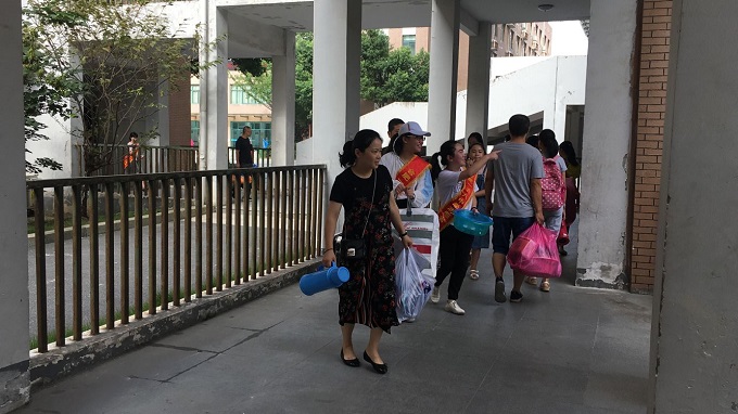 看,校园里到处都是小志愿者的身影,他们帮助新生和家长拎东西去宿舍,他们为学弟学妹们介绍学校的布置。尽管天气炎热,汗流浃背,但他们为大家服务的精神让新生家长佩服不已。