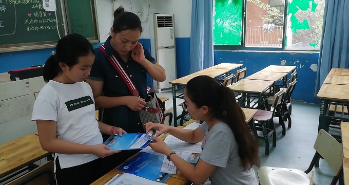 除了早到的学生和家长,还有七年级的老师们和志愿者同学们也已经早早地来到学校,他们准备好了一切,尽心尽力地做好着服务工作。