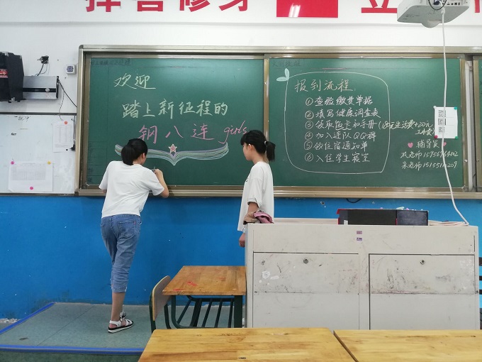 看,家长们已经在给自己的孩子办入学手续了,辅导员老师将入学流程写在黑板上,一目了然,入学事项旁有温馨提示。对于家长朋友们的疑惑和不懂之处,辅导员老师耐心讲解。