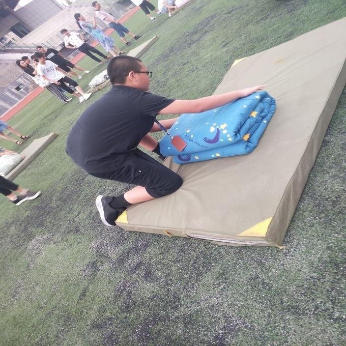 绿茵茵的青草和蔚蓝的天空交相辉映,同学们更是活力十足。每一连的学生都严格按照老师要求整理军容和端正军姿,依序进行展示,嘹亮的口号回荡在操场上,同学们精神振奋,英姿飒爽。之后进行的是叠被子展示,十四个连队都迅速而整齐在操场上叠出了豆腐干般的被子,并且整齐的摆放在床头的位置。