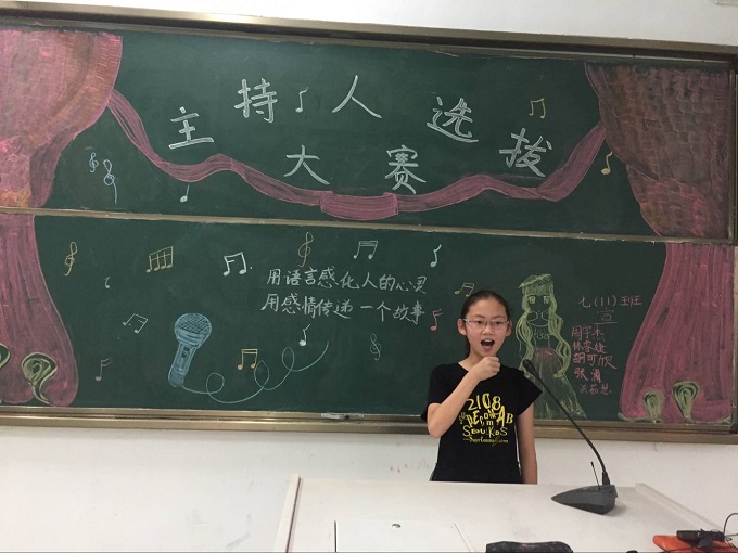 我很早就有了当主持人的梦想了,可一直“苦”于没有实现。在168这个注重学生多方面发展的中学里,我有幸和苏佳梦一起代表八班参加年级主持人竞选。