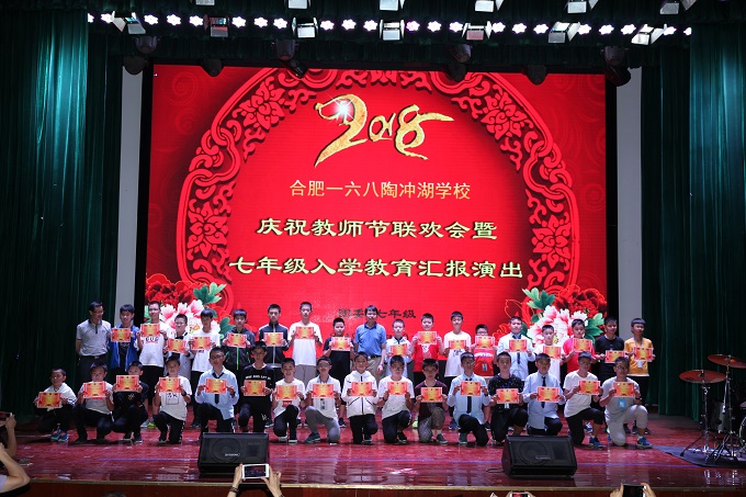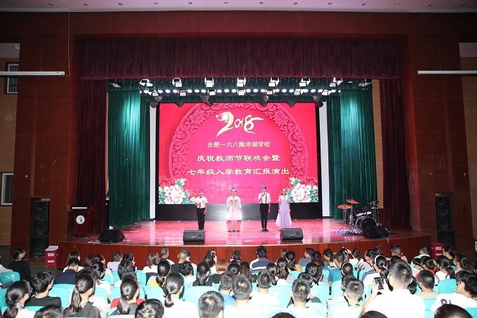 又是丹桂飘香的季节,又是金桔绽放的秋天,在这个美好的季节里,我们迎来了全国第34个教师节。在这个特殊的节日,合肥一六八陶冲湖学校艺术会堂,气氛温馨,七年级全体师生齐聚一堂,庆祝第三十四个教师节联欢会暨七年级入学教育汇报演出在晚七点准时拉开序幕。
