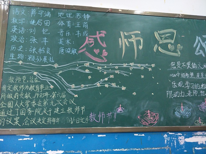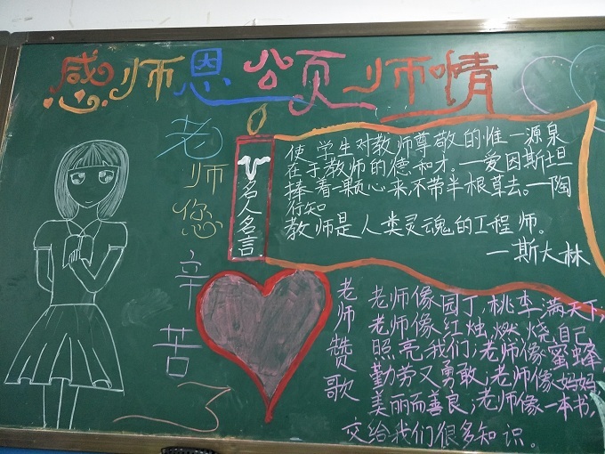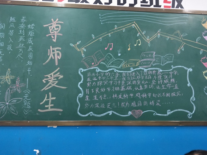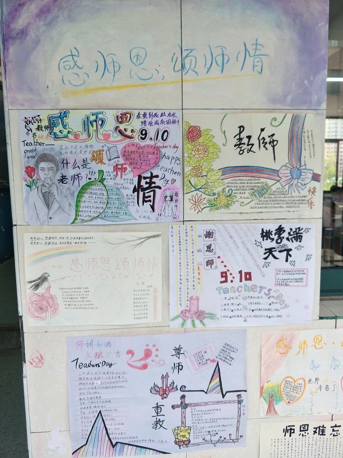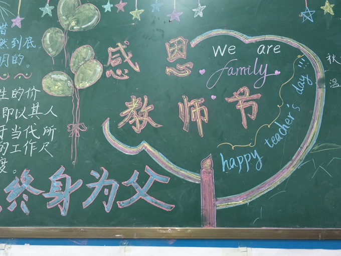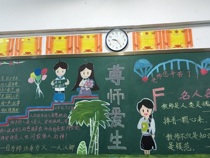 “捧着一颗心来,不带半根草去”这句话是陶行知先生的名言,老师们用粉笔在黑板上书写着对爱的诠释,老师为我们备课、批改作业所做的一切都为了一个梦想,那就是中国梦。中国梦是所有人的梦,但对老师而言不仅仅是自己的梦更是孩子们的梦,为了弘扬尊师重教的传统美德,我校初中部七年级开展“尊师爱生”黑板报与廊文化评比大赛。各班级积极参与,不仅表达了对老师的感恩之情,实现中国梦的决心,也营造了一个积极温馨的校园环境。