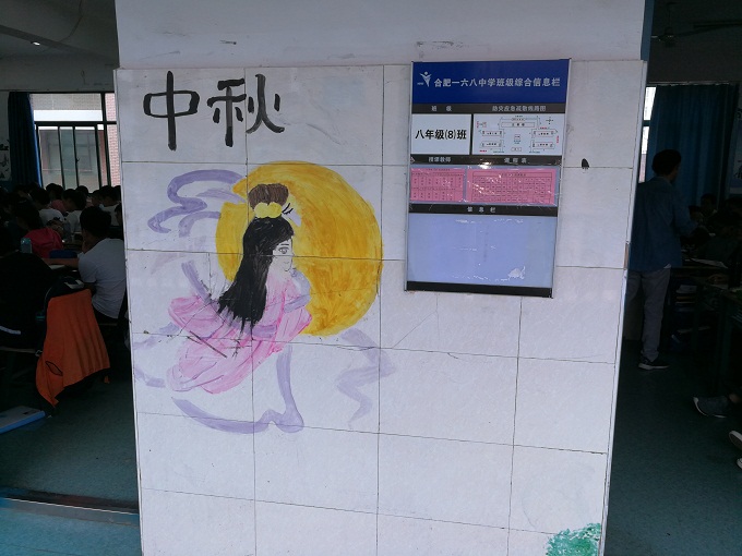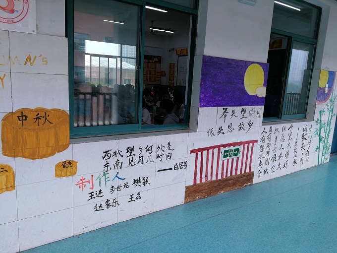 紧接着是8班,8班的廊报虽然完成得有些仓促,但仍让人眼前一亮。圆月下,井栏前,多少文人墨客诗咏中秋,几首唐诗宋词歌颂团圆。翠竹青草,鸟语花香。夜色下,嫦娥凌空而舞,意境无穷,虽简尤精。