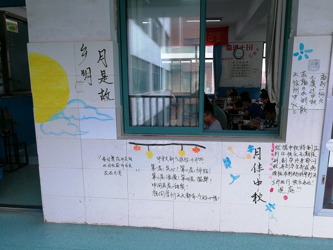 最后是10班,10班的学习气氛十分浓厚,廊报也一丝不苟,文字与画报唱和,俏皮的话语显示着朝气蓬勃,同学的留言表现着活泼向上。“月伴中秋”、“思乡月”等标题以及秀丽的字体彰显一丝不苟。青春十班奋勇向前!