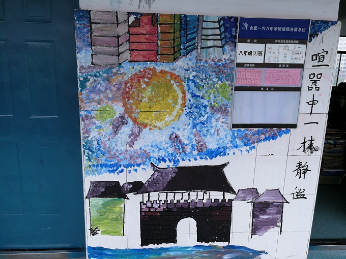 接下来是7班。7班的廊报十分有诗情画意,“喧嚣中一抹静谧”,淡墨疏影,黑瓦白砖,一曲《水调歌头》唱尽天下聚散,一轮明明新月悬于大地之上。一座古城墙更为其增添了几分古朴。认真的态度十分优秀。