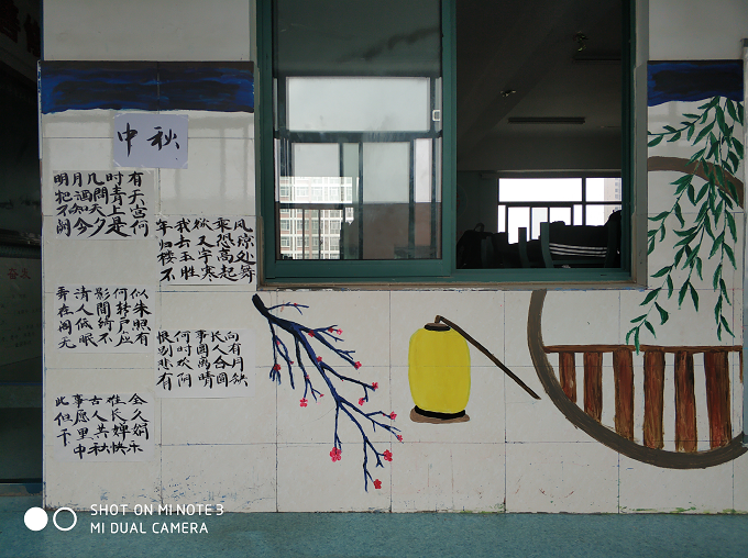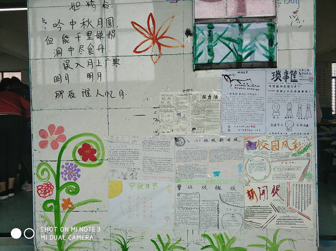 图画,诗词,人物是墙报的主要内容。或是"嫦娥奔月”的神话再现,深蓝的天空,金黄的月亮;或是《水调歌头》等脍炙人口佳作的中秋赞歌,飘逸的字体,优美的韵律。情景交融,总是令人目不暇接。而人物,则集中体现在八年级五班——赏月,没有人就如同缺少了灵魂,以漫画风格的幽默有趣为背景,通过通俗新颖的对话方式展现出“人月合一的情景,各种各样的人物生动形象,为整幅墙报增添了不少生机。简单清晰的笔调引起了不少同学的高度关注。远远望去,整个廊报如同百花齐放,书写着美妙的中秋赞歌。