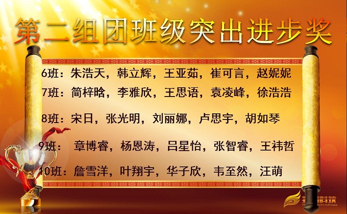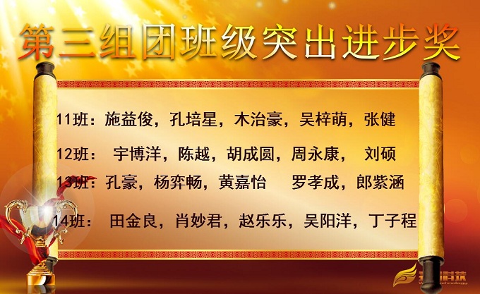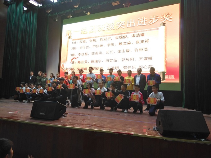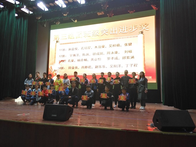大会第一项由蒋守端老师宣读对各组团班级突出进步的学生名单,分别由闵远毅、周艳芳、余伟三位组团长为学生上台颁奖,这部分学生态度端正、注重反思、努力上进,在班级中进步显著,给予鼓励,希望再接再厉。这一张张奖状就是对他们最好的激励,也是他们努力进取最好的见证,相信在以后的学习之路他们会始终保持着这一份勤奋与认真。