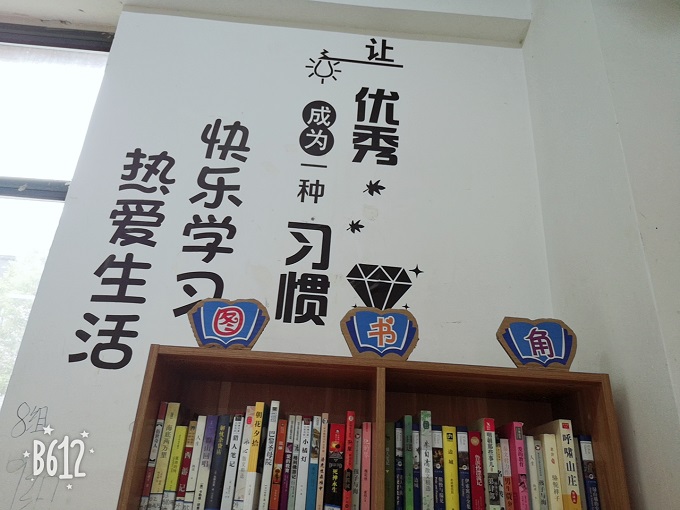 再往后看,你会发现一个书柜,上面贴着“图书角”三个字,这里就是大家借阅图书的地方啦,为此还特地请了两位图书管理员,立下了几条借阅图书的规则,每次借阅必须登记,还书也是,这样就可以保证书籍不会丢失了,如果弄丢或弄坏了书籍,也必须要等价赔偿。希望图书角可以越办越好。