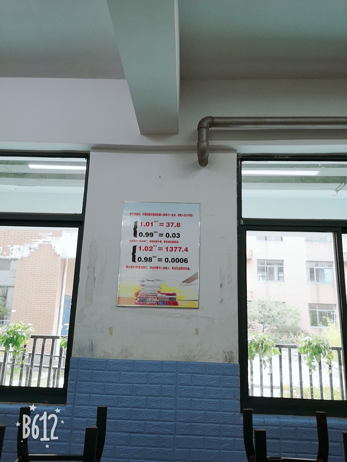 另一个标语呢?上面借用了校长的一句话“不比聪明比勤奋,不必智力比努力,不必基础比进步”让我们知道了,即使你是个蠢材,也要努力,到最后,我们比的不是天生的才能,而是后天的进步。不勤奋的人,努力过后,也就成了聪明的人。