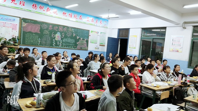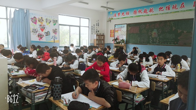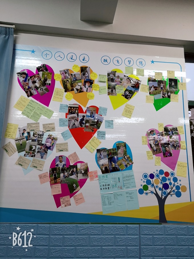来,来,来,我带你们去看看我们的教室,走进七(9)班,你一定会发现那一面贴满照片的墙,悄悄告诉你,那是我们的照片哦,每一个爱心,就是每一个小组,旁边的便签条上面,有我们这个大家庭里每一个人的目标,我们要向着目标前行。