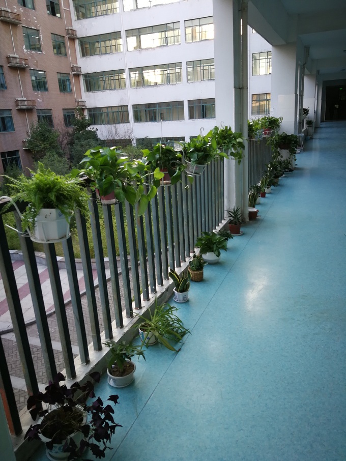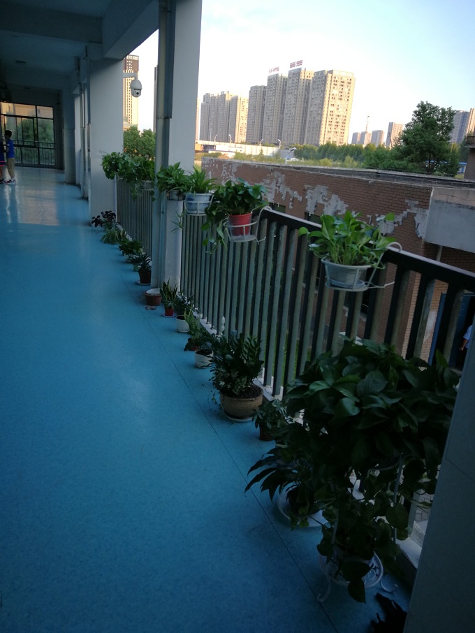 沿着长长的走廊一路向前,栏杆上的绿植青翠,泛动着生命的波光,那是流动的绿色湖水呀!一盆盆生机勃勃的绿植刚吸收了甜美的甘露。忽然,阵阵清风吹过,它们那曼妙的枝条随风而摇摆,仿佛正在对每一个来到七(4)班的人表示热烈欢迎。它们想那可爱的小精灵,给同学们眼前带来一片清新,又如同那清晨的号角,唤醒每一天的希望和憧憬。