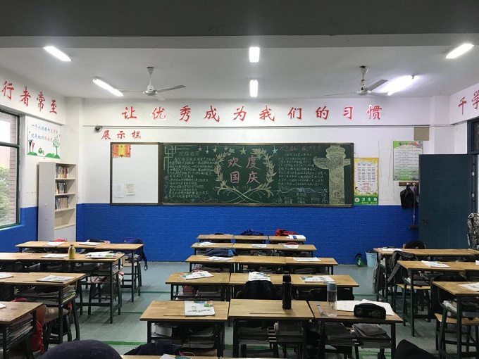 当你推开门,一个干干净净、布置美观、形式别出心裁的教室映入眼帘。看吧,由讲台向下环视四周,一排排蓝色的墙与洁白的墙面相衬着,哦,这是由班里的两位同学的父亲忙前忙后贴上去的。目光往上稍移一些,是一面色彩亮丽的展示栏。瞧瞧这个用便利贴贴成的“4”,它可是同学们的心愿啊!五十多张色彩各异,内容不同的便利贴凝成了一个美好的四班。不过有句话说得好:“不但要仰望星空,还要脚踏实地。”与它相对的,是我们的日常作业量化检查表。里面的每一次作业检查,都有着详细的记录。右边一点的是什么?LOOK!是一直以来激励同学们阅读的图书栏。最后面,是我们的展示栏,那可是记载着我们的“光辉历史”。虽然我们现在奖状不多,但我们一定会努力争取,用写满荣誉的奖状将它填满。