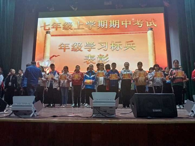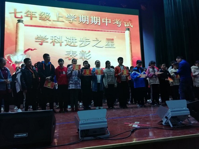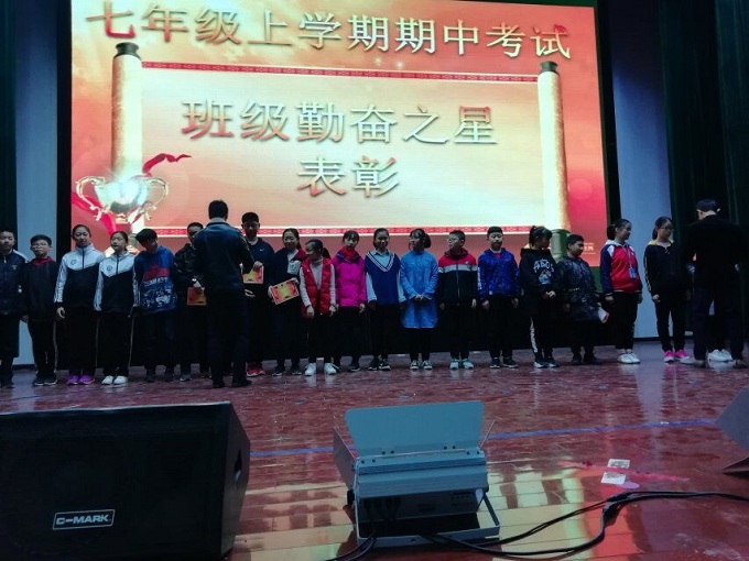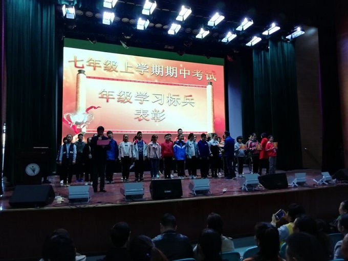 为褒奖优秀,鼓励先进,树立榜样,营造向善向上的学习氛围,进一步调动初一学子学习的主动性和积极性,11月9日下午13点,初一年级在校艺术会堂举行了期中考试表彰大会暨第二期家长学校家校交流会。会议由政教处主任吴勇主持,出席会议的有初一年级部主任赵锋林、初一年级全体教师、受表彰的学生和近700名家长。第一阶段分三项议程在艺术会堂进行,第二阶段会议由班主任在班级召开家长会。