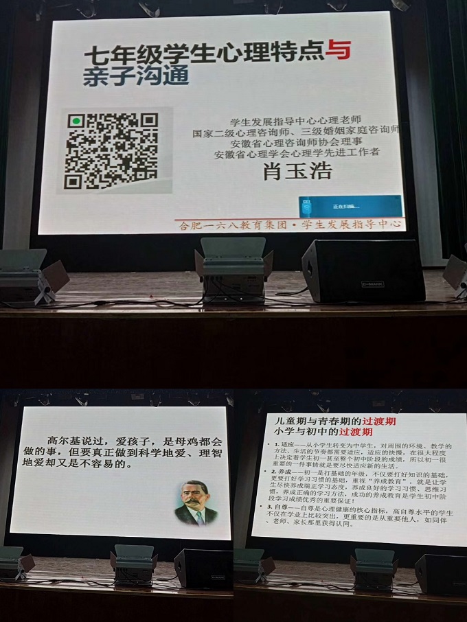 第二部分是在大礼堂由该校的肖玉浩老师(心理课老师)给家长们上了一堂生动的心理课,这堂课的主题是“儿童期与青春期的过渡期”以及“小学与初中的过渡期”,家长们听后受益匪浅。