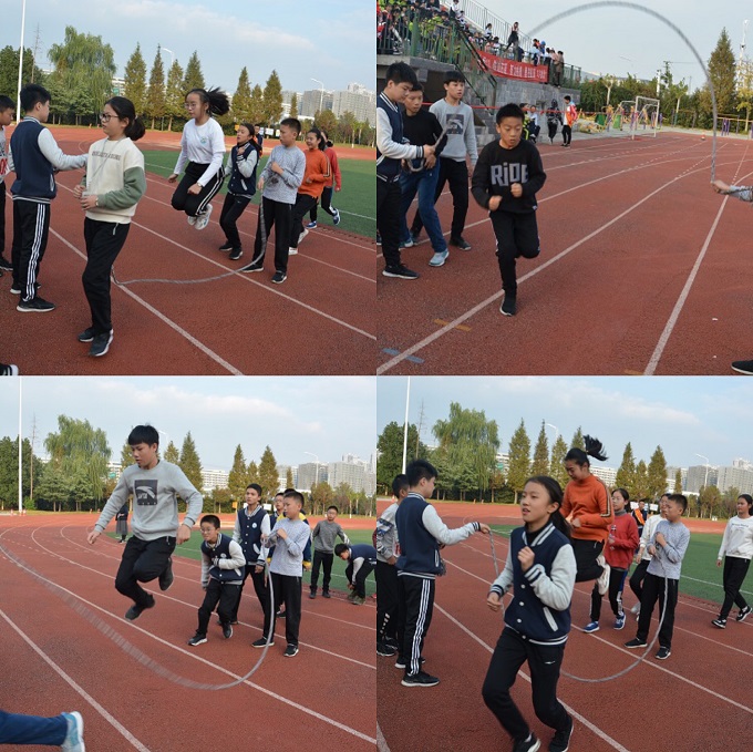 看!湛蓝的天空中,彩色的悠绳划出一道道优美的弧线,令人眼花缭乱,哦,那是我们五班的健儿们在参加跳大绳比赛,看他们富有节奏感的步伐,一次次的跨越伴着我们的心一次次的起伏,不好,断了,断了!心一下子提到了嗓子眼,绳子忽然绊到了一位同学的脚,就像一首悠扬的小调,忽然断了弦似的,大家都屏住了呼吸,一点风吹草动都撩动心弦,“呼——”幸亏悠绳的同学不急不躁,指引着同学们,渐入佳境,又奏起了悠扬的小调,悠绳在空中飞舞,心在欢乐中徜徉,五班的健儿们,你们是青春的另一种演绎,你们创造了辉煌,你们五班的骄傲!