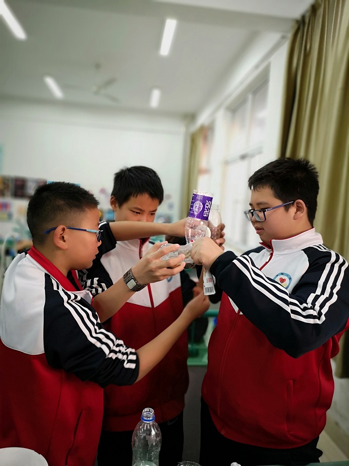 OK OK,材料全齐了,万事俱备只欠东风。我们生物社的社员们早已按捺不住自己激动的心了,一个个卷起袖子加油制作自己的生态鱼缸了。由我、杨若溪、俞璐、时语晗组成的合作小组也不甘落后,快速分工,行动起来。