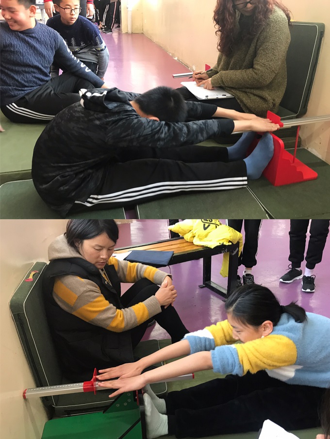 坐位体前屈对于每个同学都是艰难考验的一项检测,测试中男女生秀起自己的长胳膊长腿,在疼痛与快乐中交错着。竭尽全力绷直手臂,推动着达标尺,每向前伸展一寸都要付出疼痛与酸楚的代价,旁边的同学屏息凝视,在心底里暗暗的为同伴加油打气!