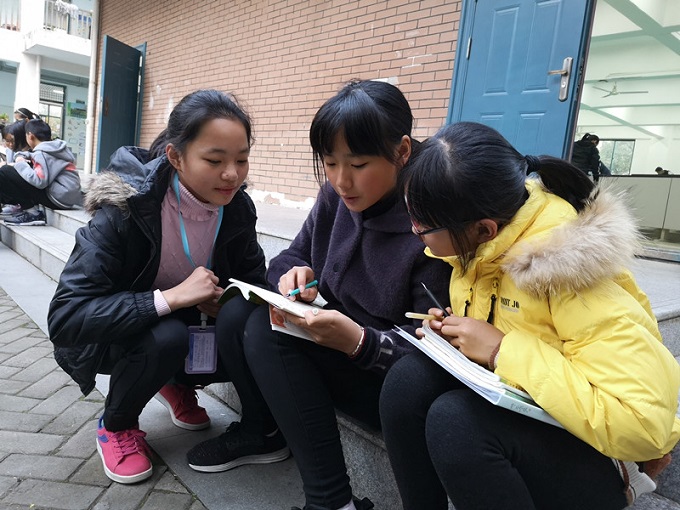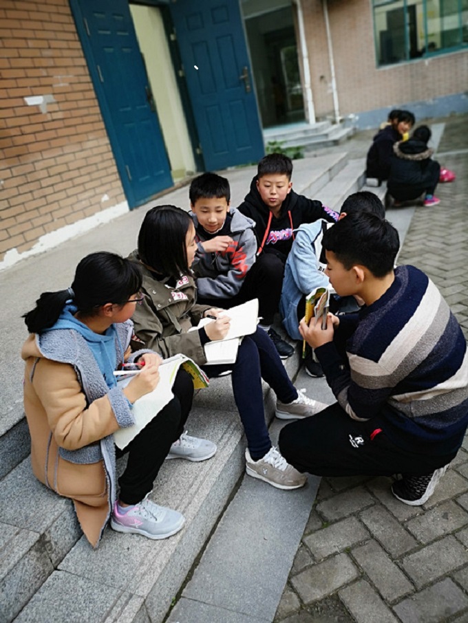 蓝天白云下,陶冲湖畔旁,在一六八陶冲湖学校鸟语花香的小花园中,只要是没有出操的大课间,就会出现这样动人的一幕:一群小老师们坐在花坛边、台阶上,边上坐着自己的“徒弟”,他们在用心地辅导着;而他们的徒弟们,则用心地聆听,时不时恍然大悟地点点头。没错,那就是我们启航二班的那群敬业的“小老师们”在开讲了。