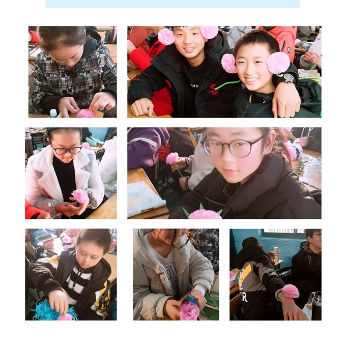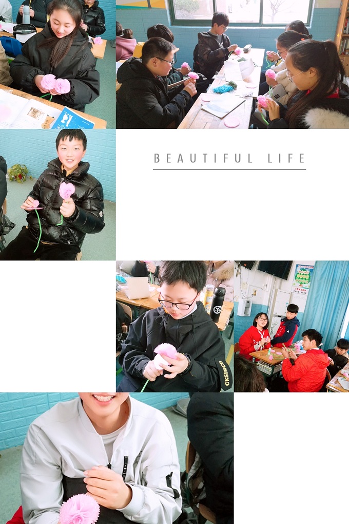 有时候,爱放在心里只是说不出口,尤其是对妈妈的爱,对老师的爱……似一首最感人的歌谣,一幅最美丽的图画。追梦九班的班主任巩老师为使活动顺利进行,提前在网上采购了DIY制作康乃馨的材料包,利用周四下午上课前对班级五位心灵手巧的女生进行了简单培训,由这五位学生对班级九组同学进行分别指导。周四下午全体女教师参加学校讲座与拓展活动,在生活委员和班长的组织下,追梦九班的感恩主题手工课正式开始了。