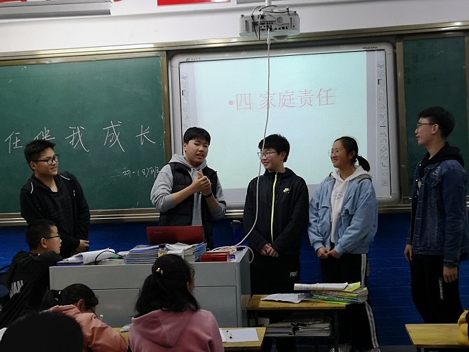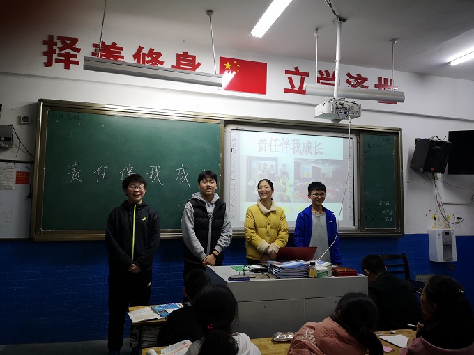 班会课上,初三(12)的小主持人们通过讲述一个个有趣的故事引出了“责任”的涵义:指分内应做的事;因没有做好分内应做的事而应承担的过错。进而指出责任分为四类:社会责任、个人责任、集体责任、家庭责任。他们重点分析了个人和集体责任中的“破窗效应”,并结合桌椅摆放、乱扔垃圾等班级不文明现象举例说明校园内的“破窗效应”。