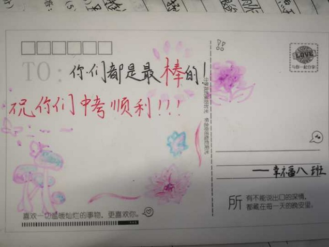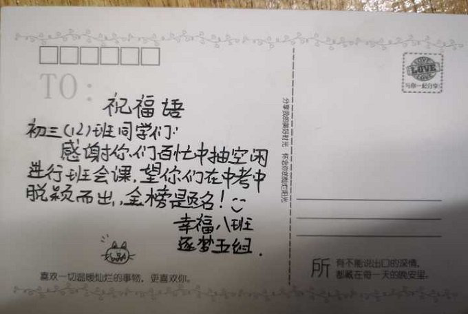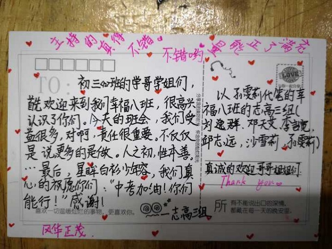 短短的几十分钟结束了,孩子们如沐春风,受益匪浅。为培养学生们的感恩意识,周老师设计了以小组为单位,向学长们道谢和送祝福环节。看,一张张明信片上写满了他们的心声!