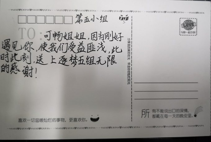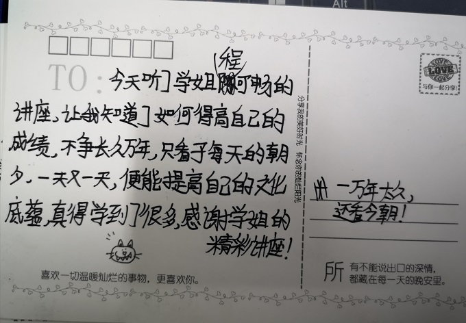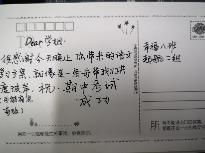 班会课上,周老师特地邀请了该校八(6)班的一位学姐--程可畅来给幸福八班的孩子们分享语文学习的心得体会。她阳光自信、开朗乐观,酷爱阅读和写作,语文成绩位于年级前列。她以大家熟知的李玉刚《刚好遇见你》拉开了与学弟学妹们交流的序幕。她从语文阅读和写作两个方面介绍了自己平时的一些做法和思考,并总结语文学习应做到:丰富、积淀我们自己的文化底蕴;厚积薄发,并引用顾炎武的“自督读书”,告诉我们要学会长期积累。听着眼前的这位学姐滔滔不绝,幸福八班的孩子们认真倾听,积极互动,从学姐的身上汲取了学习语文的精神力量。看,以小组为单位的一张张卡片,让我们欣喜地感受到:语文学习的种子在悄悄萌发!
