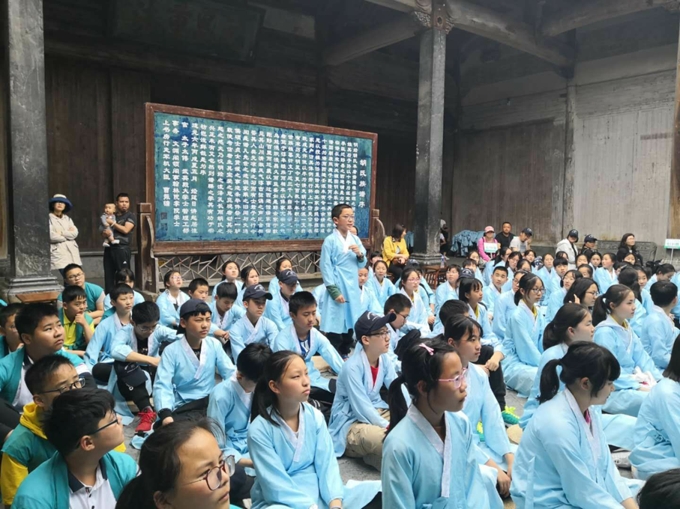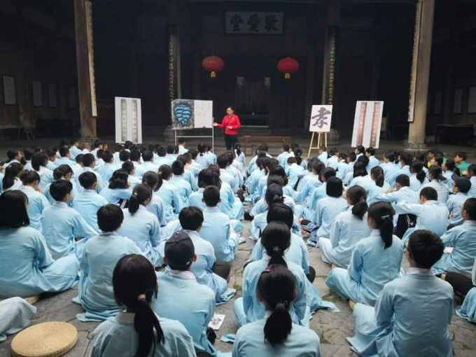 接着我们又来到了“敬爱堂”,大家全部换上了古代的汉服,盘腿坐下听老师讲课。在这节课中,我了解到了敬爱堂中的一大“孝”字,上侧右部是一个仰面拱手作揖、跪地孝敬长辈的读书生,而左侧是尖嘴猴子的脸。能孝敬长辈则为争气儿孙,反之就是返祖,退化为猴子。充分体现了“敬老尊老”、“兄弟互爱”的中华美德。这里有一句俗话叫做:“孩子不读书,好比养了一头猪;三代不读书,好比养了一群猪”。从这一句话可以看出徽州重视学业的程度之深。