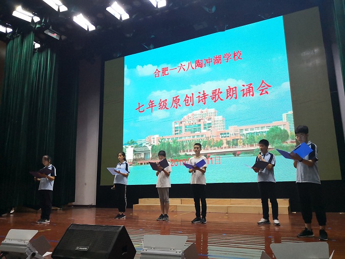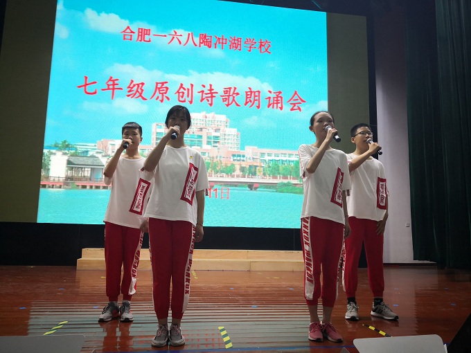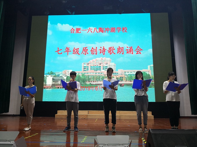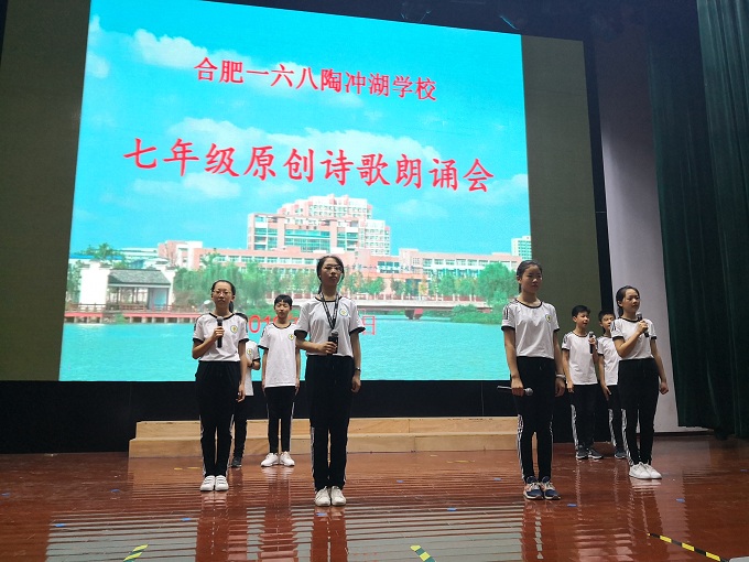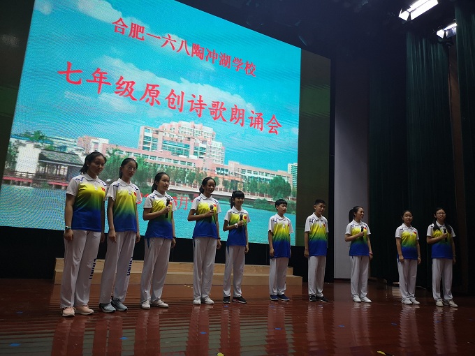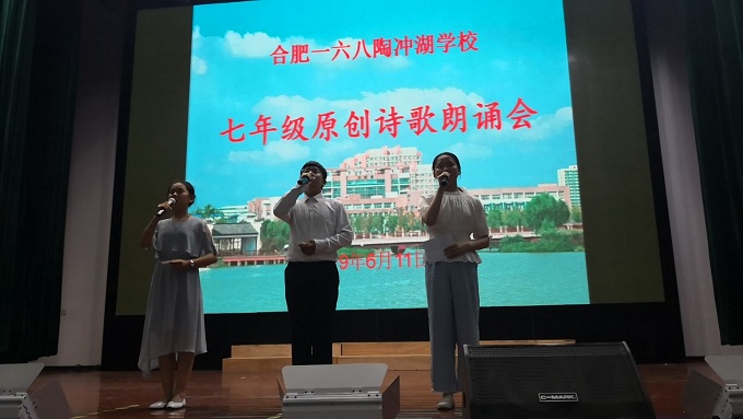 2919年6月11日下午四时,合肥一六八陶冲湖学校七年级学生齐聚艺术会堂,以诗歌朗诵的方式唱响青春之歌,展示青春风采。
