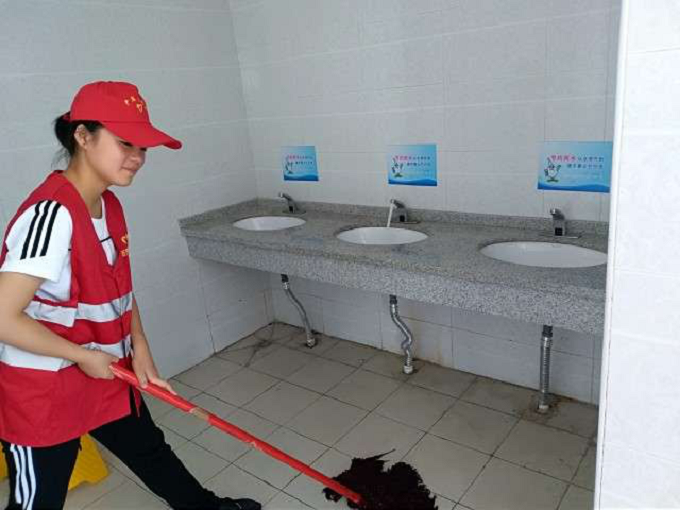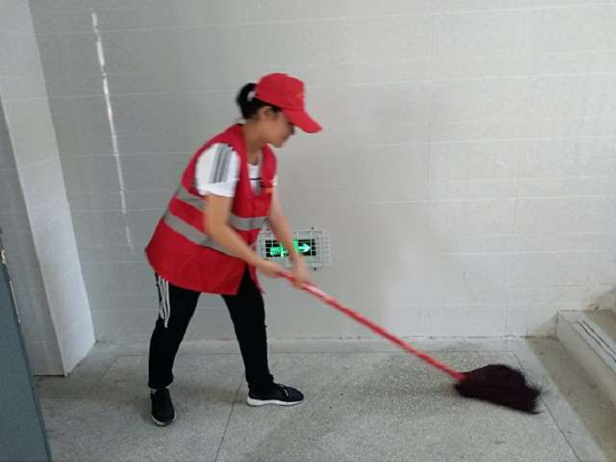首先是清扫前五层的楼梯。我“斗志昂扬“”地来到第一层,楼梯上有少量的灰,还算比较整洁。我先去洗手间涮了涮拖把,随后将洗净的拖把在地上均匀地拖动着,不一会儿,地面便干干净净了。我高兴地挥了挥手,心想:看来,清洁工也蛮容易的呢!我便继续向第二层发起进攻。