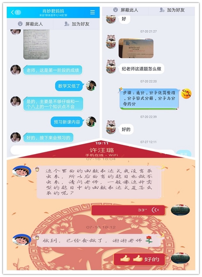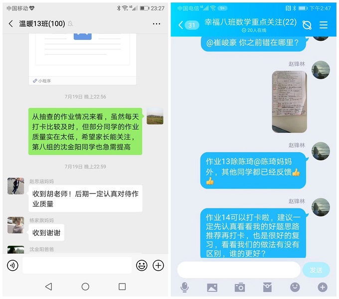 此外,不定期在QQ、微信上还进行抽查制。有在班级群里老师和同学们一起写数学暑假作业,定期公布重点题的解题思路,并抽查部分同学,要求他们语音讲思路;有建立领跑群、加油群、关注群等,随机进行暑假作业本和思维训练营上重点题目的抽查;有每周六确定抽查名单,周日检查抽查人员复习和预习情况等方式。