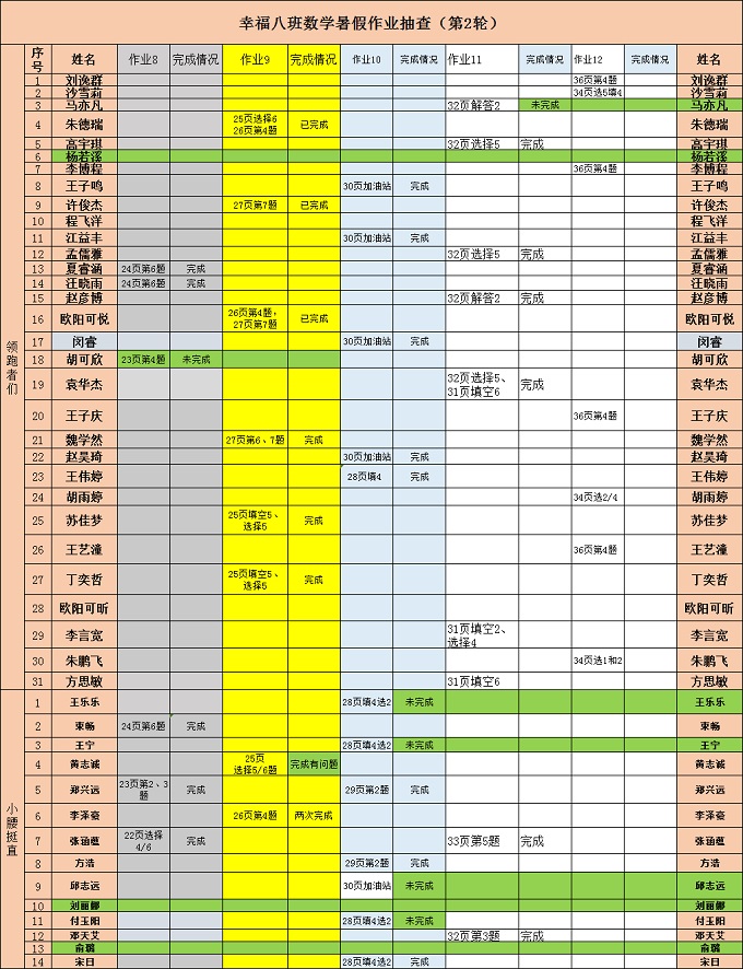 每阶段测试前及时提醒,订正批改试卷,了解考试成绩,进行试卷分析;要求小组长对本小组学生学科作业完成情况每周统计并上报;在两个月的假期中指导孩子如何对数学学科学习做好计划,安排好学习进度,以复习巩固+预习为主线,配以各自学习的特点,以达到事半功倍的效果。